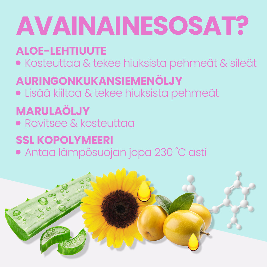 Aloe-lehtiuute kosteuttaa ja pehmentää hiuksia, auringonkukansiemenöljy lisää kiiltoa ja tekee hiuksista pehmeät, kun taas marulaöljy ravitsee ja kosteuttaa hiuksia. Sodium Laneth-40 Maleate antaa tehokkaan lämpösuojan ja suojaa hiuksia jopa 230 °C lämpötiloissa.