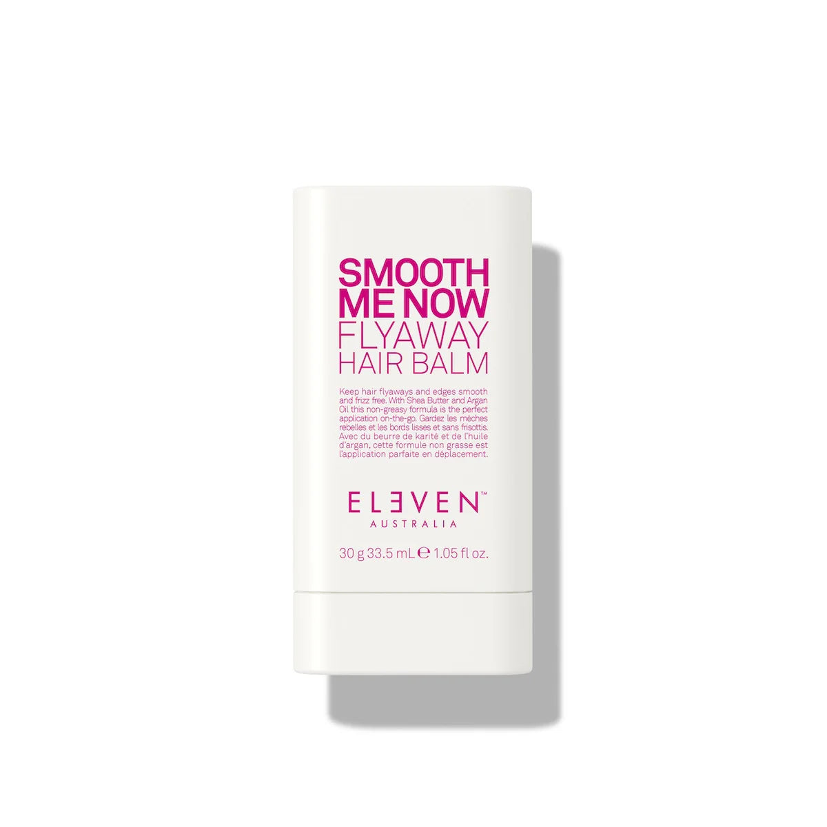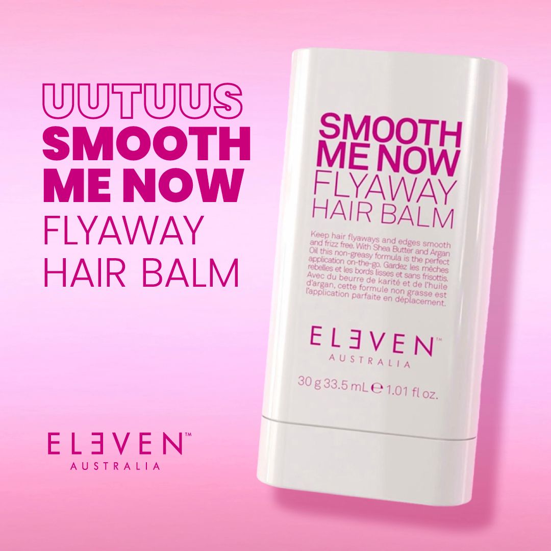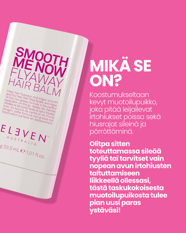 ELEVEN Australia Smooth Me Now Flyaway Balm on kätevä muotoilupuikko, joka kesyttää leijailevat hiukset ja silottaa hiukset sekä hiusrajan hetkessä. Tämä koostumukseltaan kevyt, mutta tehokas puikko sisältää sheavoita ja arganöljyä, jotka ravitsevat ja pehmentävät hiuksia ilman raskasta tunnetta tai vahamaista pintaa. Auringonkukan- ja rypäleensiemenöljy kosteuttavat hiuksia ja tuovat upean kiillon. Täydellinen valinta niin sileään sleek bun -nutturaan kuin aukikammattuihin lookkeihin. Lopputuloksena pörrötön, kiiltävä ja viimeistelty look – helposti ja nopeasti. Kompakti pakkaus sujahtaa helposti käsilaukkuun.