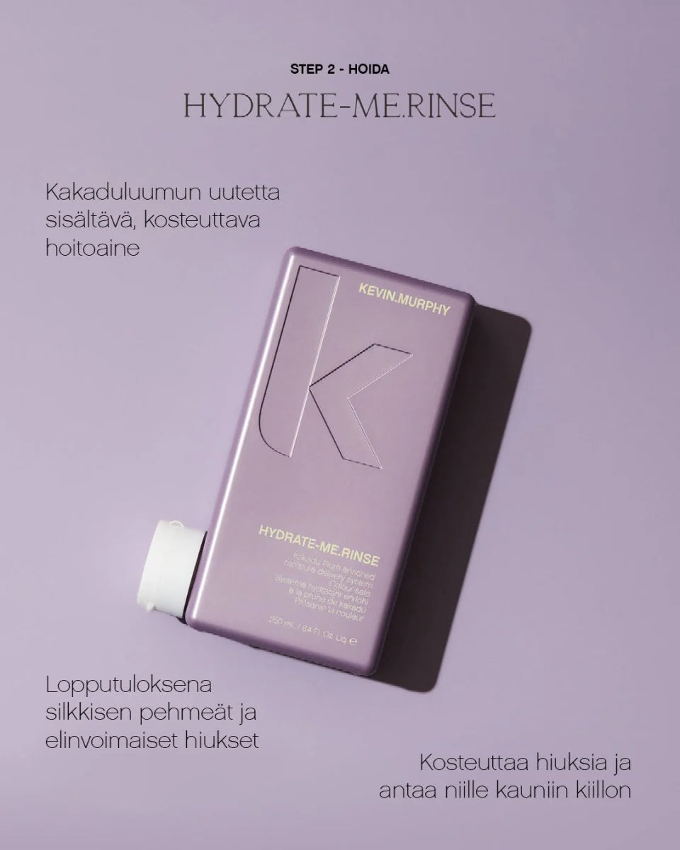 HYDRATE-ME.RINSE on kakaduluumun uutetta, vitamiineja ja leväuutetta sisältävä hoitoaine, joka kosteuttaa hiuksia ja antaa niille kauniin kiillon. Lopputuloksena sileät, helposti kammattavat ja elinvoimaiset hiukset.